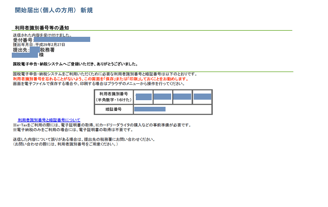 8.最後に利用者識別番号と暗証番号が表示され、これを使って電子申告をすることができます。