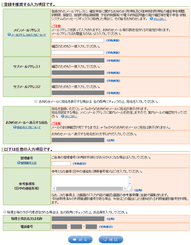 メールアドレスの入力も任意ですが、入力しておけば確定申告に関するお知らせ等がメールで届きます。予定納税が必要な場合などはリマインドにもなりますので入力しておくとよいでしょう。