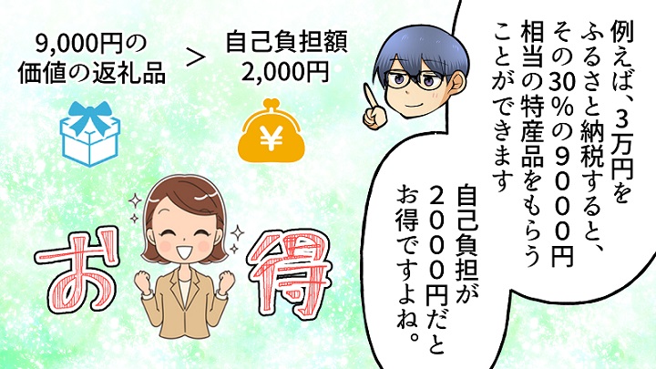 ふるさと納税する先の地方自治体によっては、地元の特産品などの返礼品を受けとることもできます。ふるさと納税をした金額の30%を目安として返礼品が用意されていることが多いため、自己負担が2,000円で済めば、それを上回る分が「得する」ことになります。
