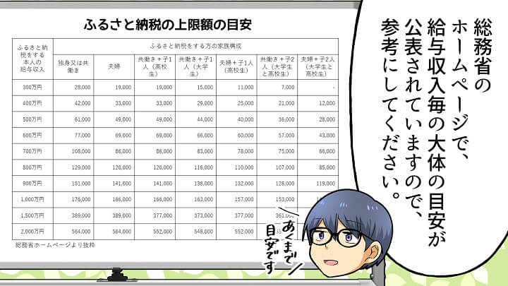 全額控除されるふるさと納税額(年間上限)の目安は総務省のホームページで公表されています。