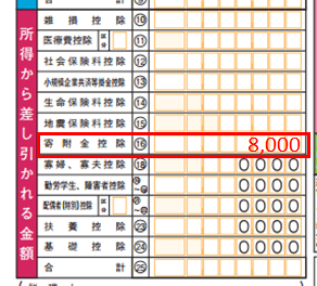 この事例では、ふるさと納税した金額10,000円から2,000円を差し引いた8,000円を記入しています。