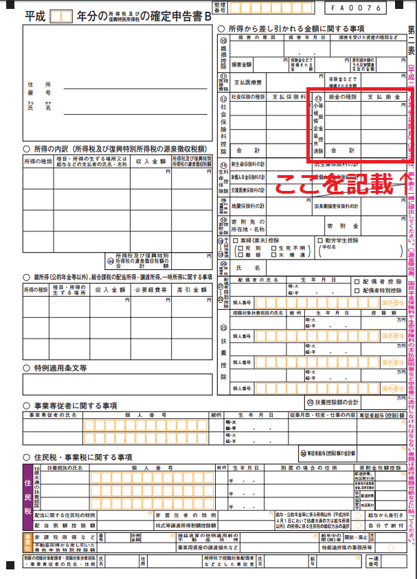 確定申告をする場合は、確定申告書の第二表に必要事項を記載し、支払った掛金の証明書を確定申告書に添付または提示する必要があります。なお、電子申告(e-Tax)を利用する場合には添付または提示を省略することができます。