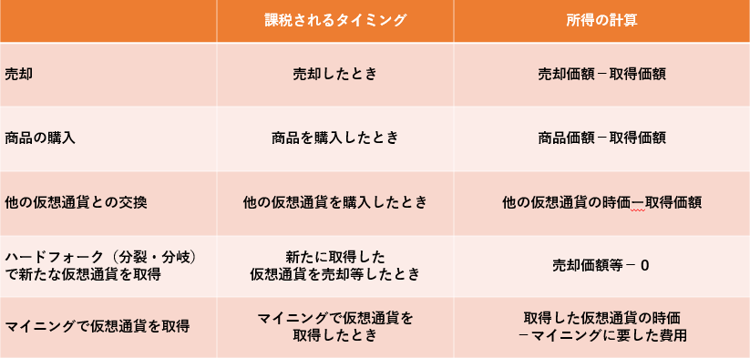 仮想通貨取引の種類ごとの課税されるタイミングと所得の計算方法は次のとおりとなります。
