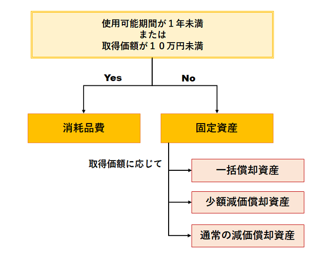 「使用可能期間が1年未満」または「取得価額が10万円未満」のものは、経費(消耗品費)処理することが可能です。経費(消耗品費)処理すれば、その年に全額経費計上できることとなり、その年の税金は少なくて済むこととなります。